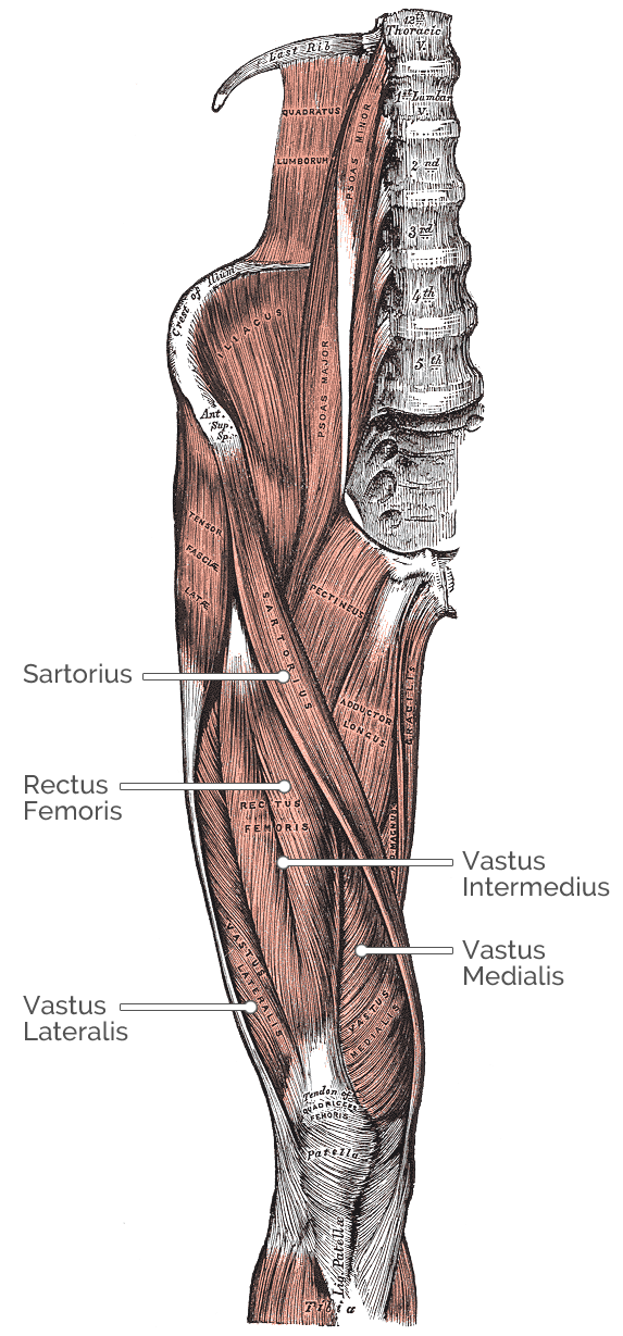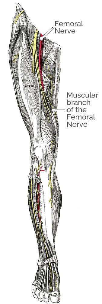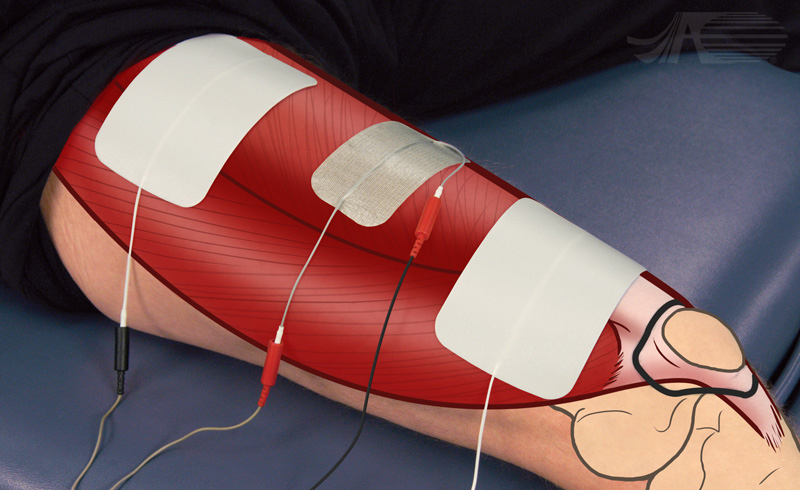 Electrode placement for knee extension dual channel for power activation. Two channels of stimulation are used with an asymmetric biphasic waveform. The negative electrode is placed very proximal and the positive lead is attached to the dual leadwire electrode placed at the mid-thigh. The channel two negative electrode is placed distally, midline to medially. The positive lead is attached to the dual leadwire electrode at the mid-thigh.